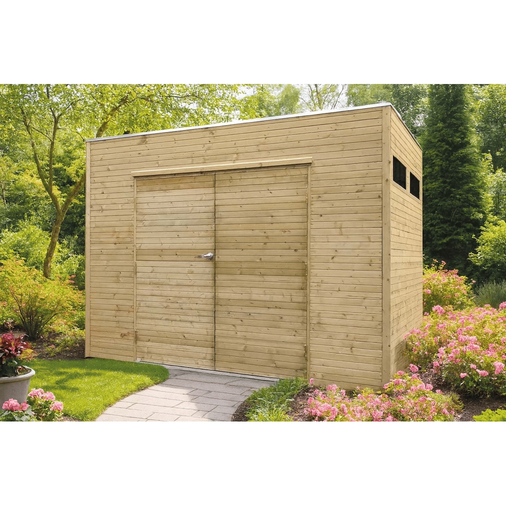 Het tuinhuis is uitgerust met een dubbele houten deur met kindveilig slot en gehard veiligheidsglas. Het ingebouwde ventilatiesysteem en de aluminium drempel zorgen voor extra comfort en gemakkelijke toegang, zelfs met een fiets of kruiwagen.