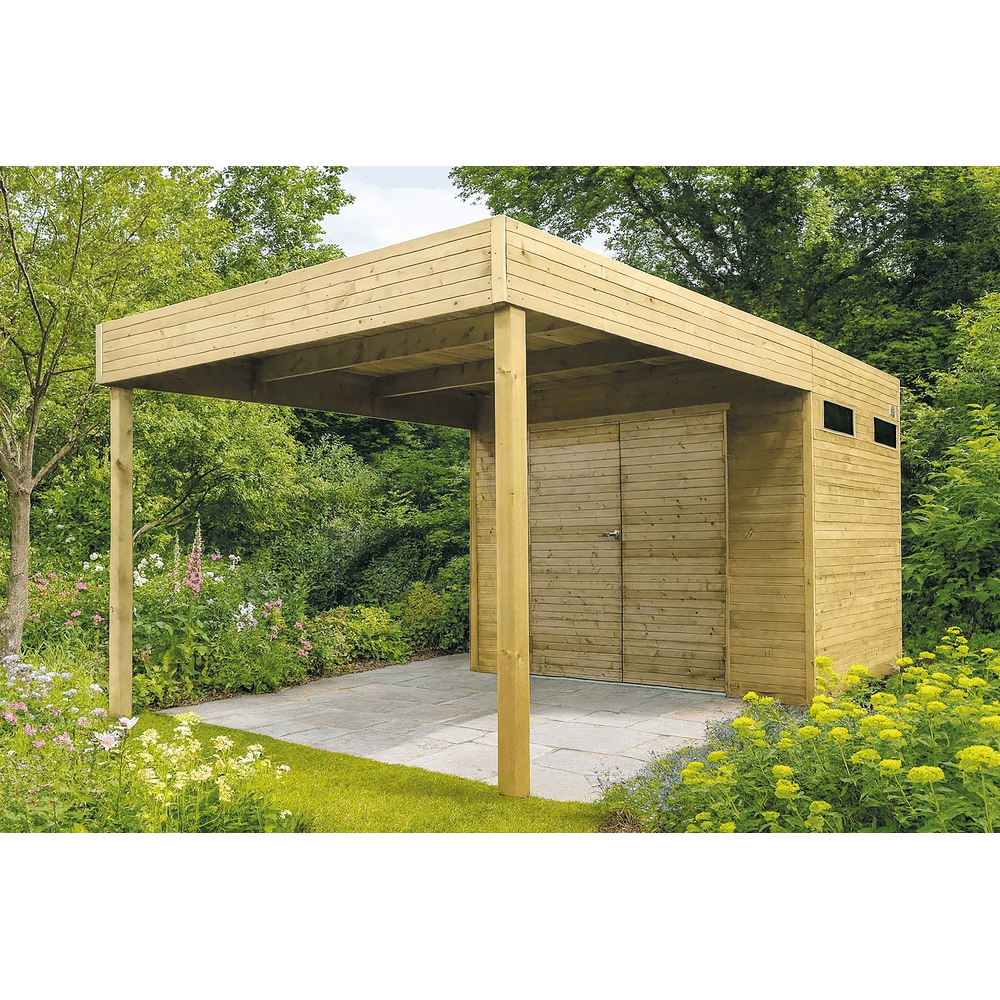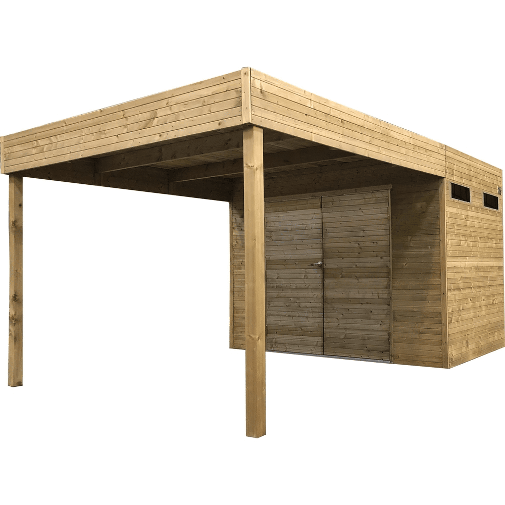 Het vlakke dak bestaat uit 16 mm houten profielen met duurzame EPDM dakbedekking. Het vurenhout is autoclave geïmpregneerd in groene kleur, waardoor het beter bestand is tegen weersinvloeden, schimmels en houtaantastende insecten.