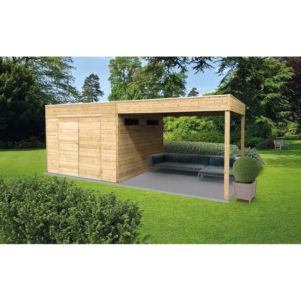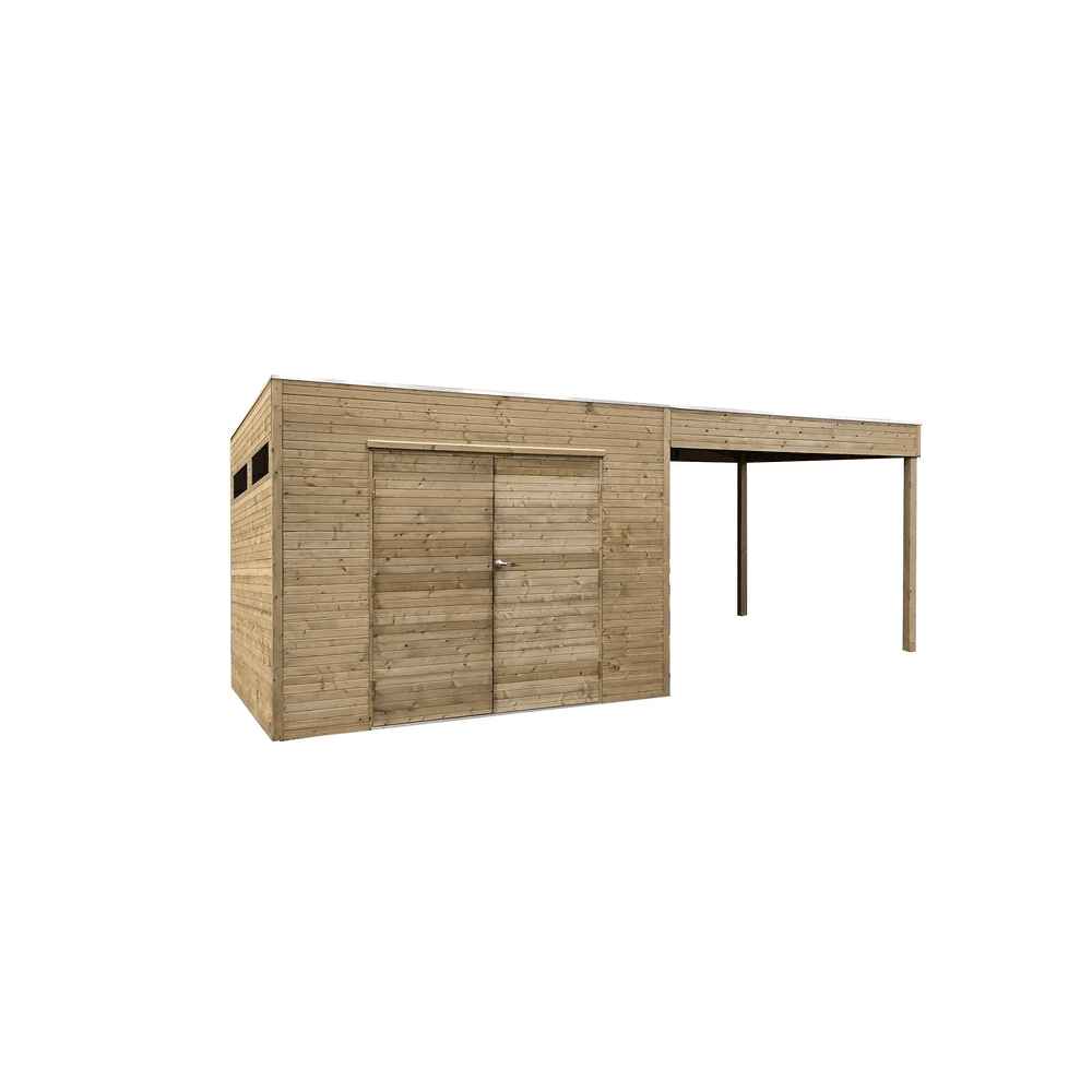 Het vlakke dak bestaat uit 16 mm houten profielen met EPDM dakbedekking. Het hout is autoclave geïmpregneerd in groene kleur, waardoor het bestand is tegen weersinvloeden, schimmels en houtaantastende insecten. Het tuinhuis wordt geleverd in 4 pakketten voor eenvoudige montage.