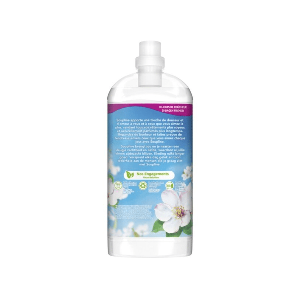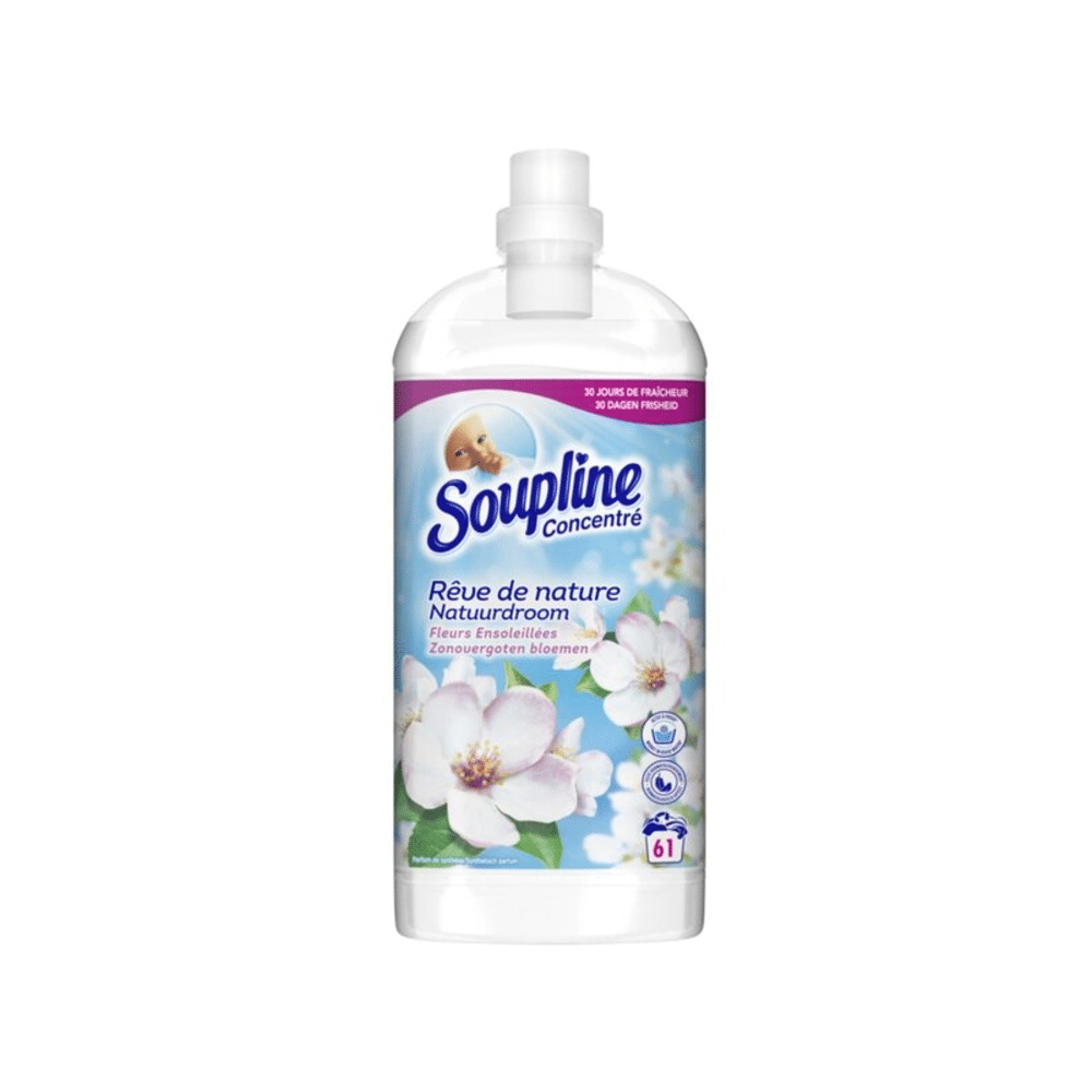 De Soupline Wasverzachter Zonovergoten Bloemen Geconcentreerd geeft je kleding een langdurige frisse en bloemige geur. Je was voelt zacht en verzorgd aan bij elk wasprogramma.