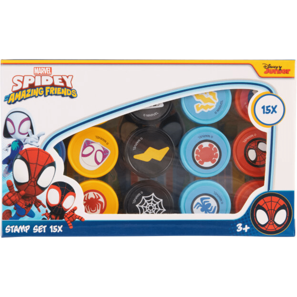 De Spidey stempelset laat kinderen creatief aan de slag met stempelen en tekenen.