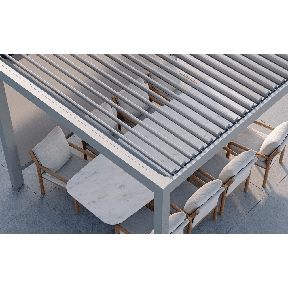 De overkapping is vervaardigd uit hoogwaardig industrieel aluminium wat zorgt voor een solide constructie. Verder is de overkapping voorzien van flexibele shutters in het dak of een compleet oprolbaar dak.
