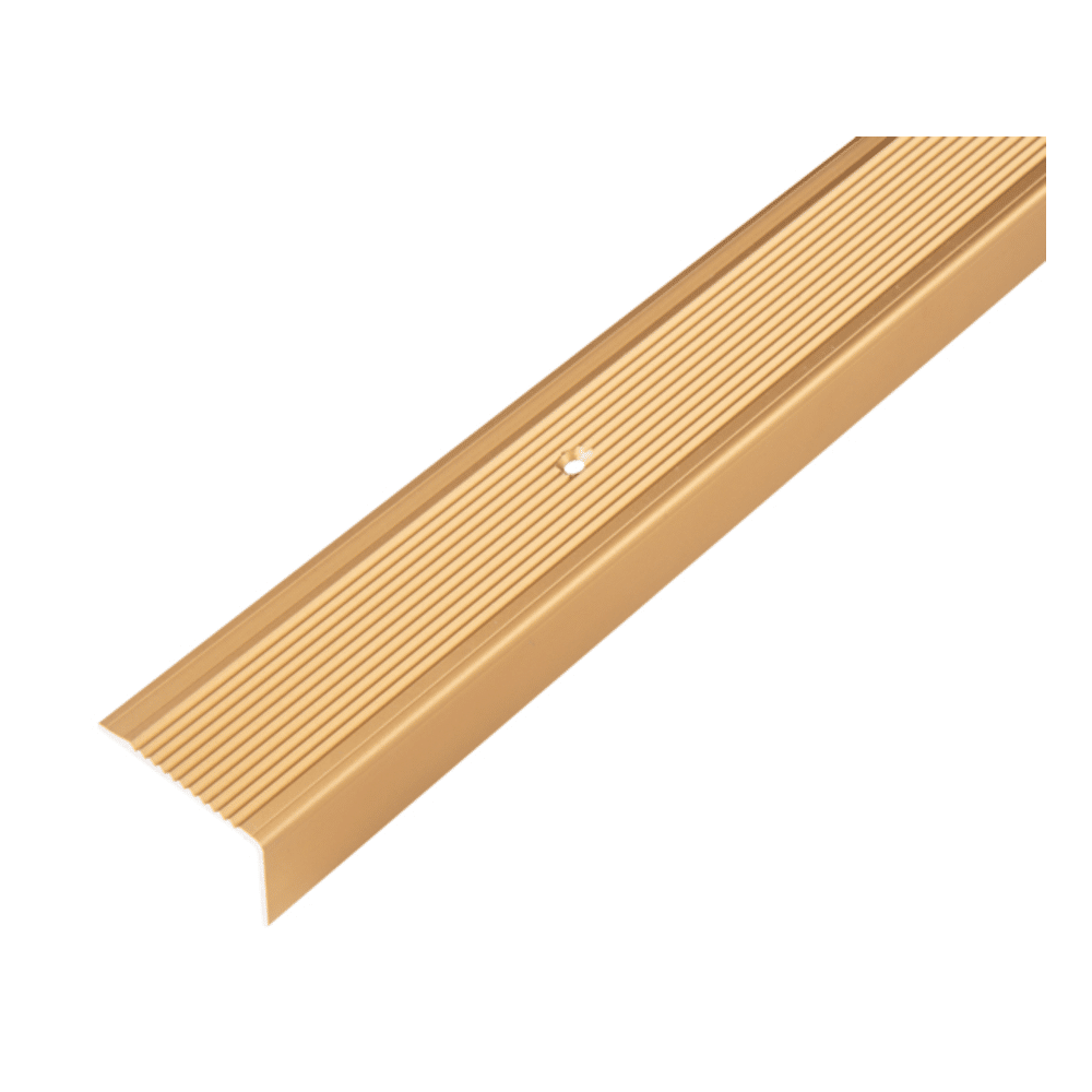 Deze goudkleurige aluminium trapneus biedt duurzaamheid, slijtvastheid en een luxueuze uitstraling. Ideaal voor laminaat, vinyl, parket en tegeltrappen.