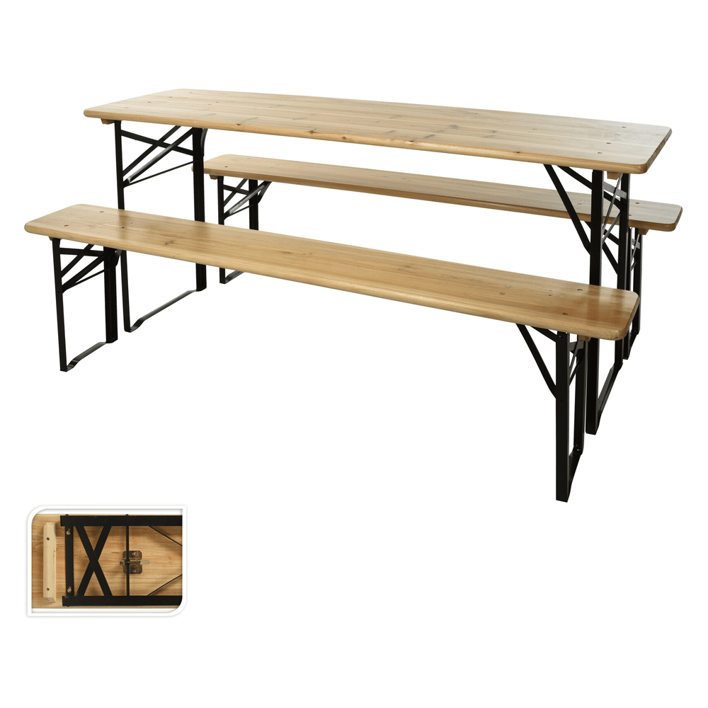 Met deze opvouwbare picknickset breng je meteen sfeer én gemak naar je tuin of terras. Het stevige houten blad en de twee ruime banken bieden plaats aan het hele gezelschap. Klaar met feesten? Inklappen maar – en hup, zo weer plaats vrij.- Opvouwbare picknicktafel met zwart metalen onderstel