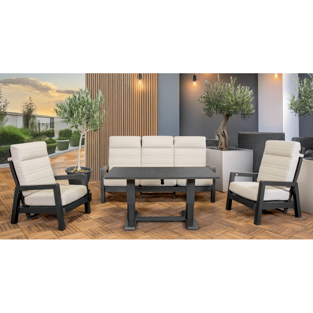 De Valence verstelbare loungeset combineert comfort, flexibiliteit en modern design. Met een 3-zits bank, twee fauteuils, een tafel en verstelbare rugleuningen geniet je optimaal van elk moment buiten.