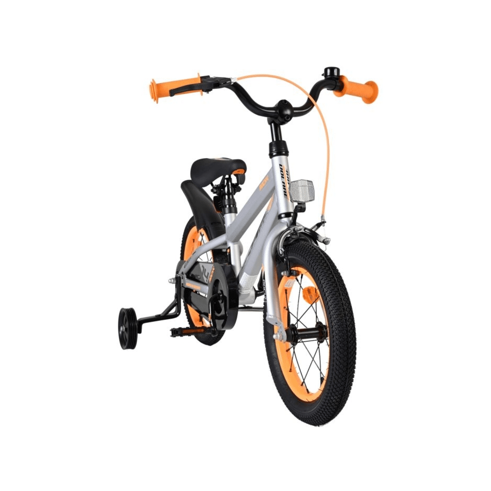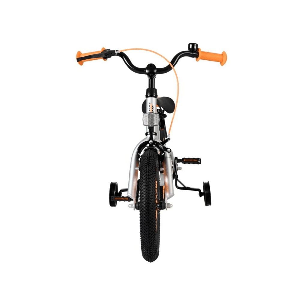 Met een robuust frame, veilige remmen en optionele zijwieltjes fiets je stabiel en veilig. Het sportieve, grijze design maakt elke rit extra leuk.- Stevig stalen frame