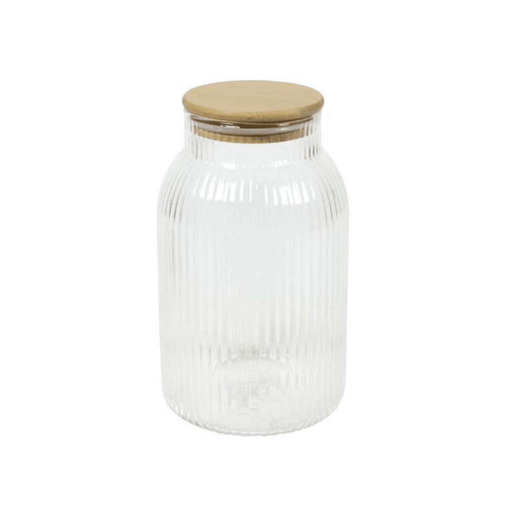 Deze mooie glazen voorraadpot met bamboe deksel is dé perfecte mix van praktisch en trendy. Dankzij het moderne lijnenpatroon en het duurzame deksel past hij in elke keukenstijl. Ideaal om pasta, koekjes, koffie of andere lekkernijen vers te houden. En eerlijk? Hij ziet er ook gewoon leuk uit op je aanrecht!Een must-have voor jouw keuken