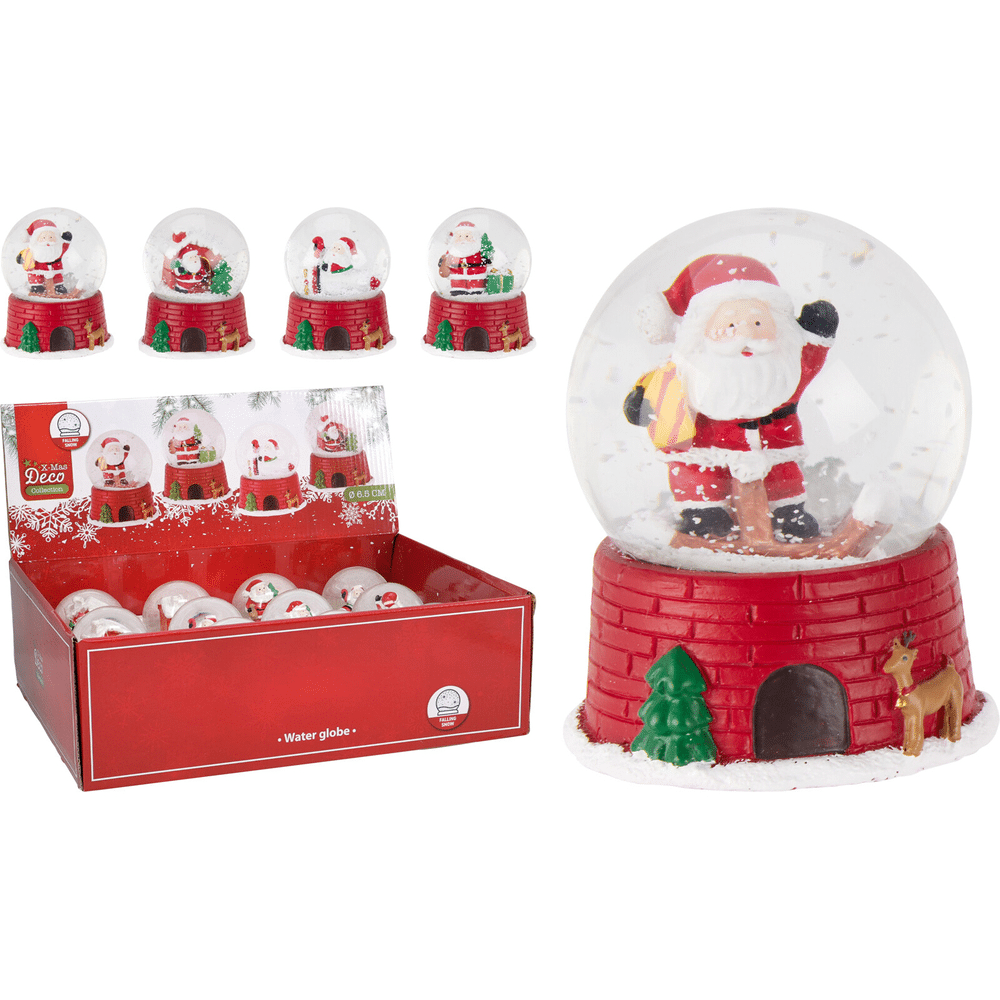 Deze glazen sneeuwbol staat op een sokkel in rode baksteenlook en zit vol charme. Binnenin danst de Kerstman in een sfeervol decor. De sneeuw dwarrelt vrolijk rond zodra je hem beweegt — *instant kerstgevoel!*- Glazen bol met prachtige kerstdetails
